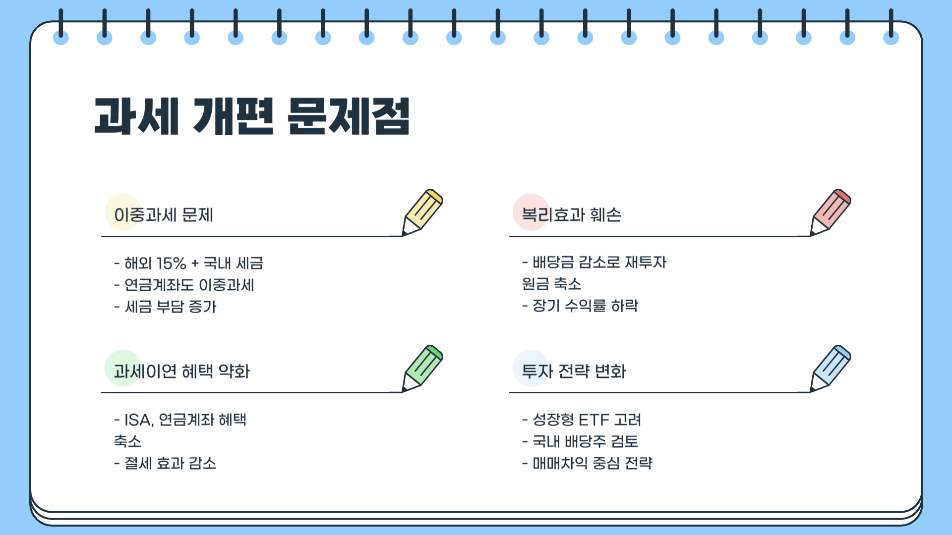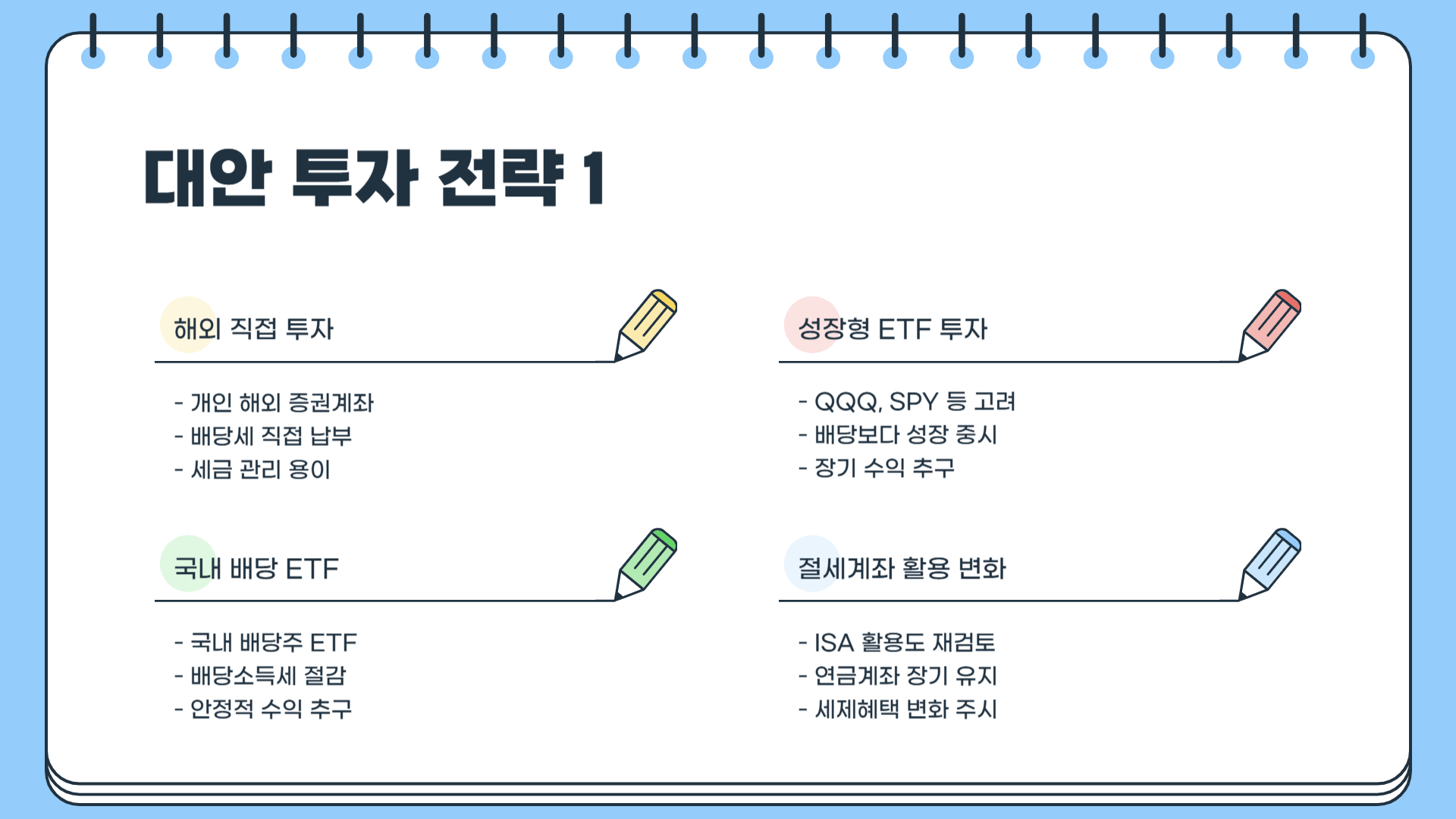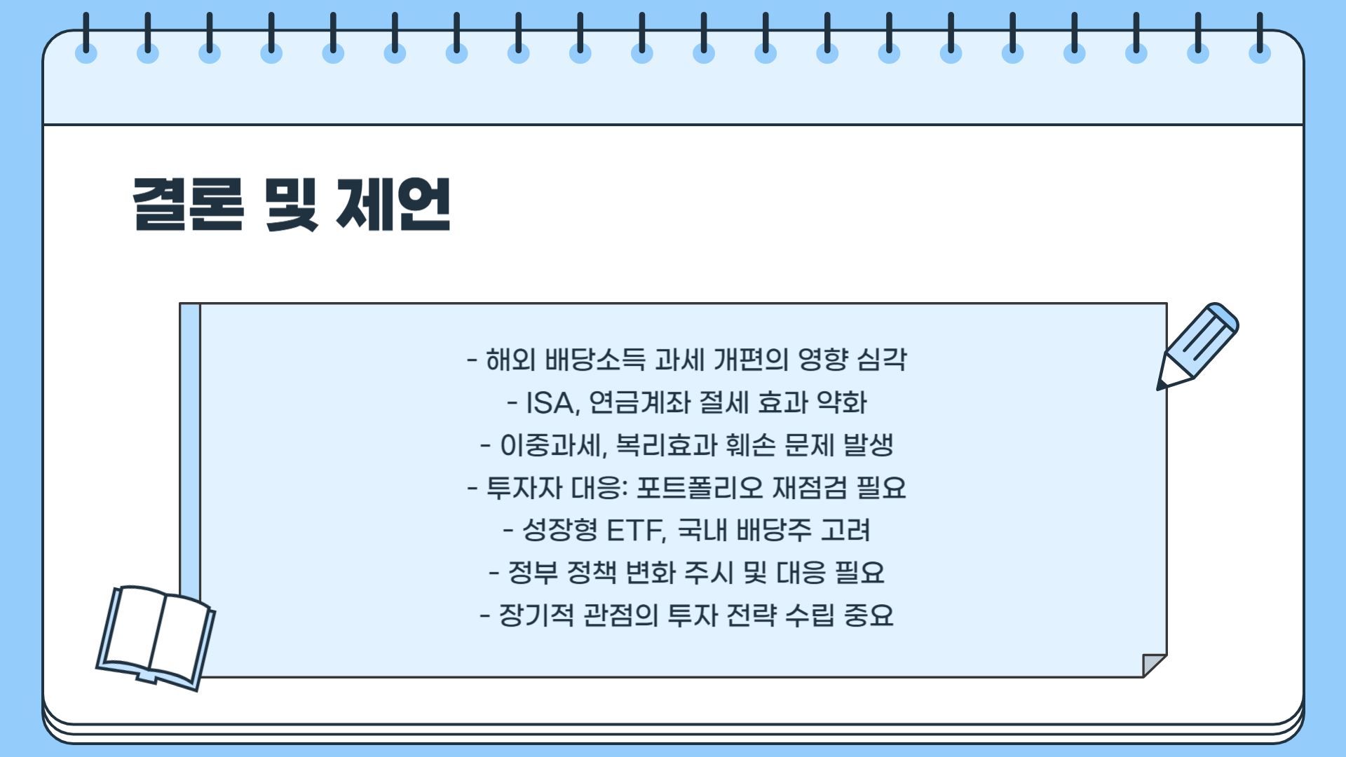 2025년 해외 배당소득 과세 개편은 ISA·연금계좌를 활용한 배당 투자자들에게 상당한 변화를 가져올 전망이다. 배당 중심 투자자는 전략을 조정할 필요가 있으며, 성장형 ETF 활용, 국내 배당 ETF 투자, 정부 보완책 모니터링 등을 통해 대응 전략을 마련해야 한다. 앞으로 변화하는 세법을 지속적으로 주시하며 장기적인 투자 플랜을 재정비하는 것이 중요하다.