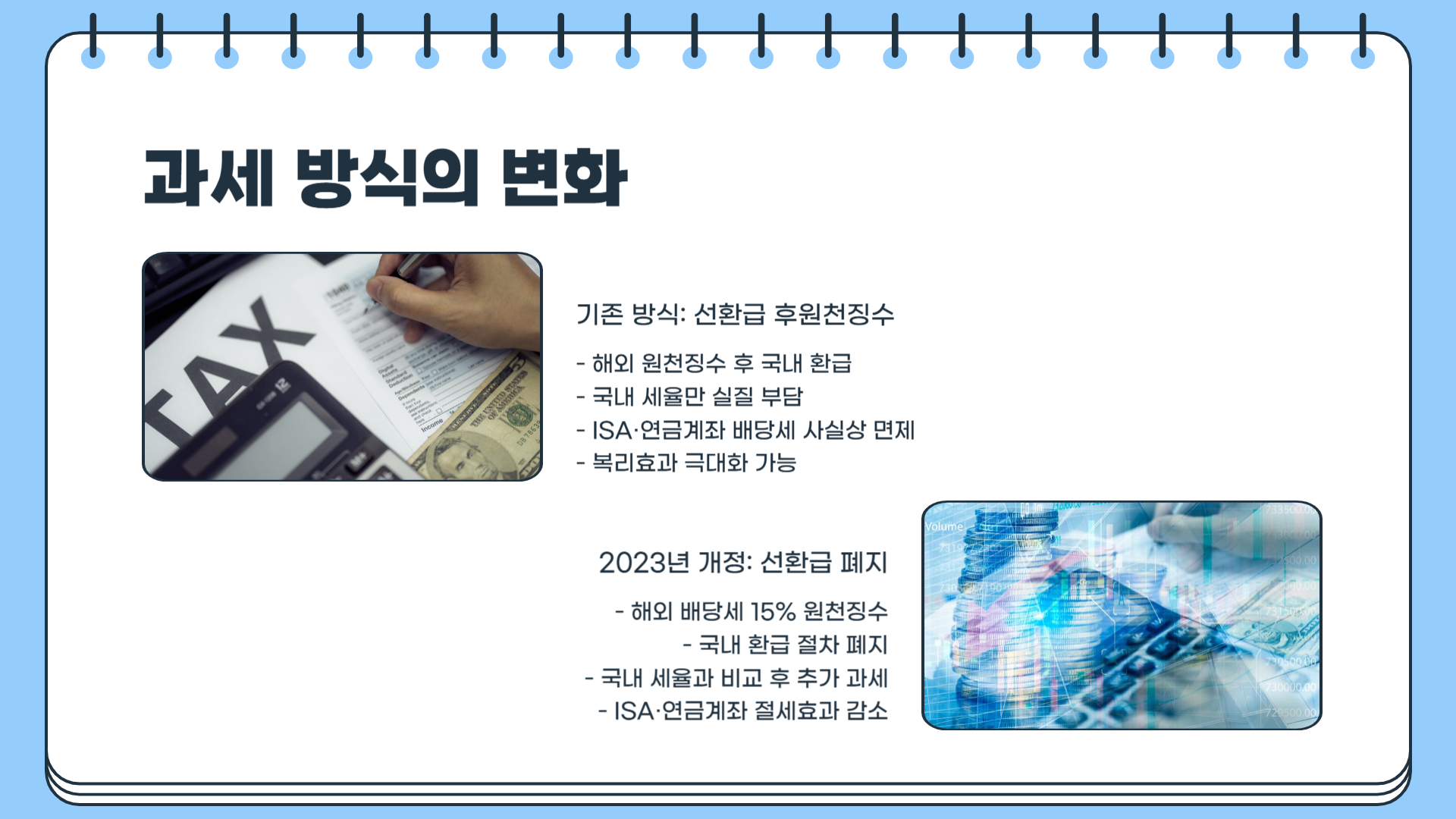 - ISA 및 연금저축계좌의 경우, 사실상 배당소득세가 면제되는 효과가 있었다.